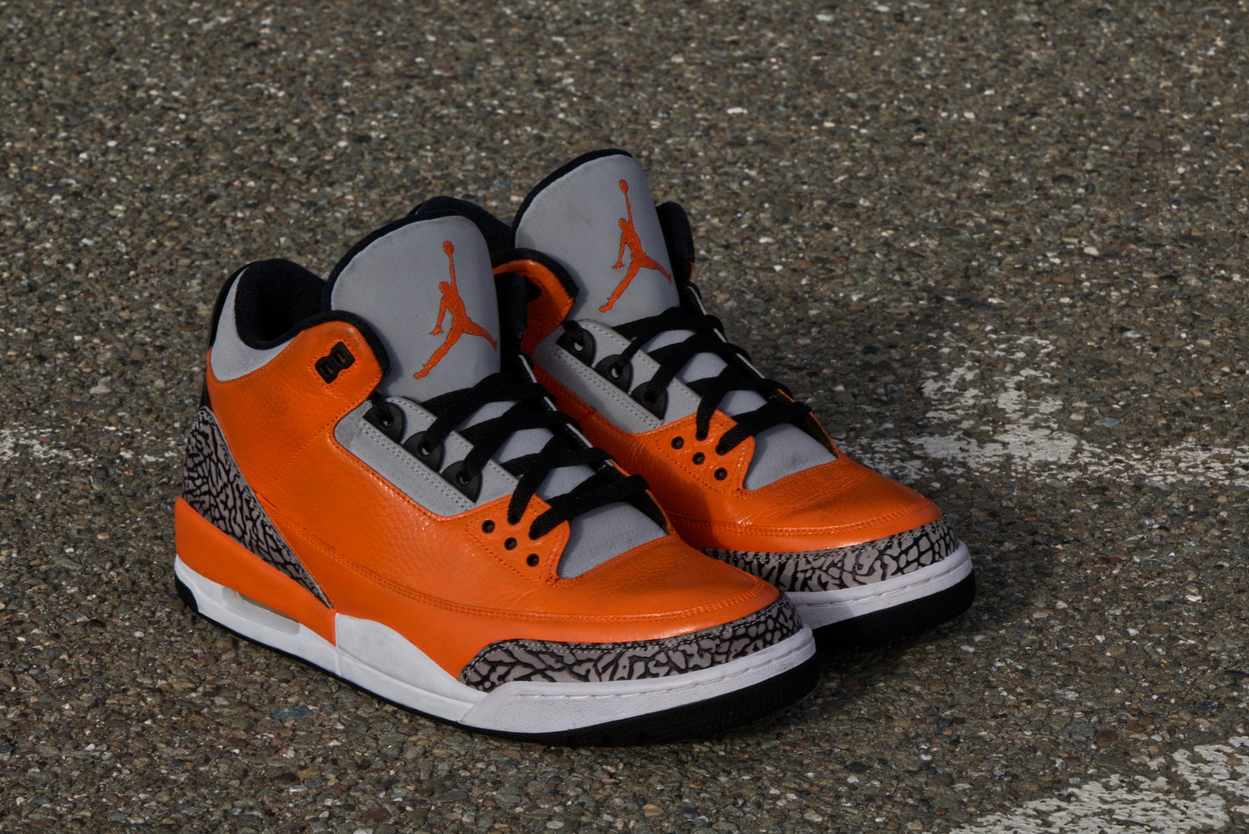 "Shattered Backboard" Nike Air Jordan 3.. The "Shattered Backboard" Air Jordan 3s were fully conceptualized by our client, who plays basketball at University of the Pacific. He supplied a pair of worn "Sport Blue" Jordan 3s and asked that we swap out select black and blue areas with orange to match his school's colors. First we painted the upper, midsole, and Jumpman accents orange. Then we painted the liner and eyelets black, and dyed the translucent blue outsoles black to finish them off. While reviewing the pictures that we shot of the finished customs, a close friend said that they reminded him of the "Shattered Backboard" Jordan 1s, so we decided to go with that name. If you would like something similar done to your shoes, send us an inquiry today!.