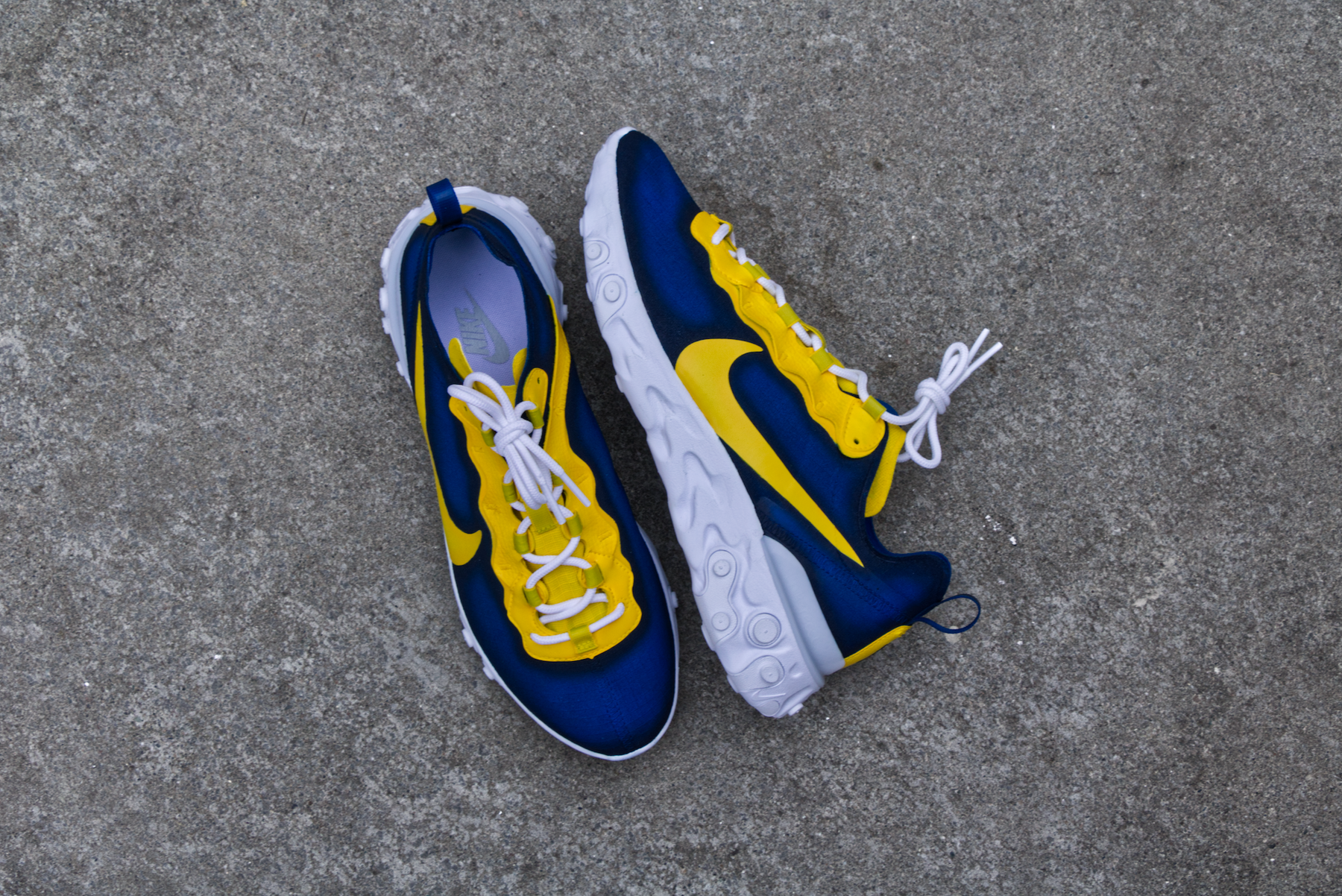 Warriors Nike React Element 55.. Every now and then I get what I call “customization fever” or the urge to paint every pair of shoes in sight. Back in mid-2019 I caught that fever but thankfully had a pair of all-white Nike React Element 55s laying around collecting dust. This was before my home-team, the Golden State Warriors, descended into the dark abyss of injuries and roster issues so I decided to paint the shoes in a simple blue and gold colorway.. First I quickly prepped the shoes and then proceeded to mask everything except the swoosh, eyelets, tongue, and heel tab. Then I airbrushed a few base coats of yellow. Once I established a solid base I shaded the outer edges of each yellow panel with a slightly darker yellow gold. Next I removed the tape and masked the yellow parts of the shoes. After that I mixed a custom blue which I then airbrushed the upper and liner of the shoes with. Finally, I mixed a darker version of that blue and shaded the outlines of the upper. Technically these shoes are done since I sprayed finisher on them and laced them up. For awhile I had plans of adding a Warriors logo or two around the toe or heel areas, but I never had enough spare time to do that. One day, likely after I write this, I’ll list them up for sale so go check out our catalog of customs, sneakers, and stencils to see if they’re your size and still in stock!.